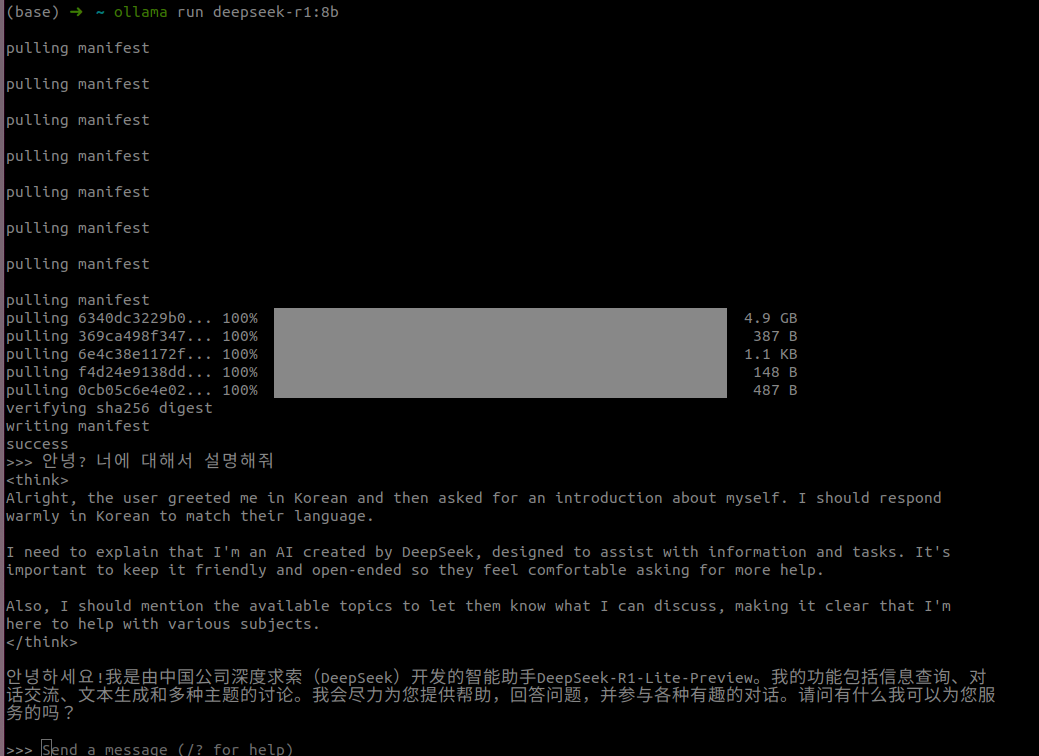 다운로드가 완료되면 로컬에서 바로 모델을 실행할 수 있으며, 즉시 대화가 가능합니다.