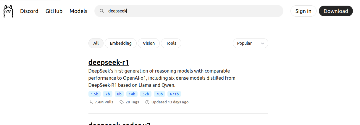 모델 탭에서 "deepseek"라는 키워드로 검색하면 "deepseek-r1" 모델이 첫 번째로 나타납니다.