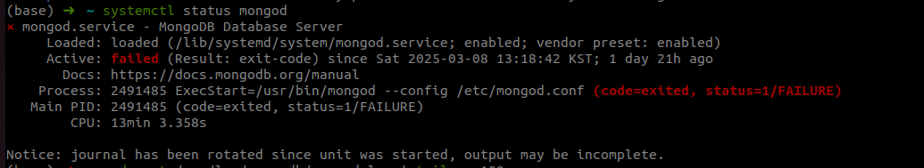 - - Active: failed (Result: exit-code)와 status=1/FAILURE는 MongoDB가 비정상적으로 종료되었음을 나타냅니다.