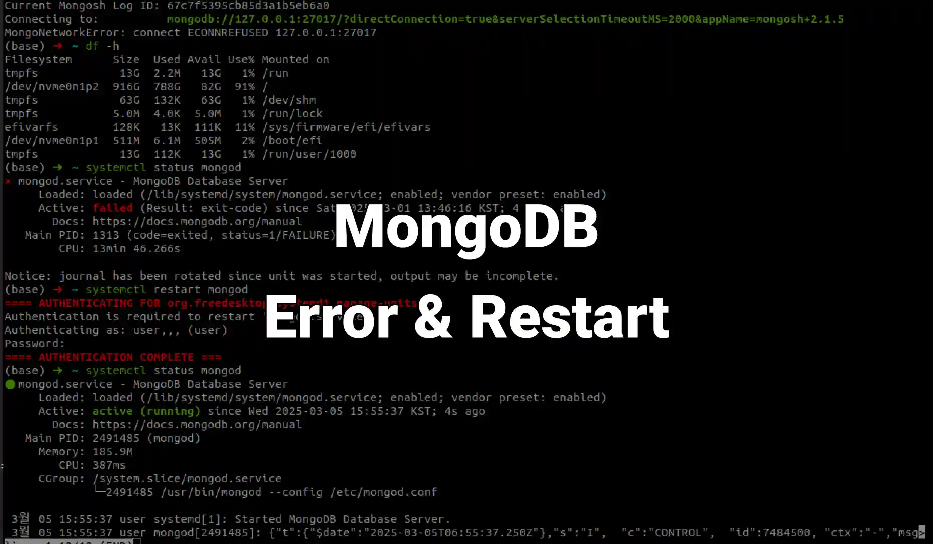 현재 MongoDB 서버는 정상적으로 동작하고 있으며, 데이터베이스도 무사히 돌아가고 있습니다. 이번 경험은 단순한 오류 해결 이상의 의미가 있었습니다. 시스템 관리의 기본을 익히고, 문제를 해결하는 논리적인 접근 방식을 배울 수 있었어요.