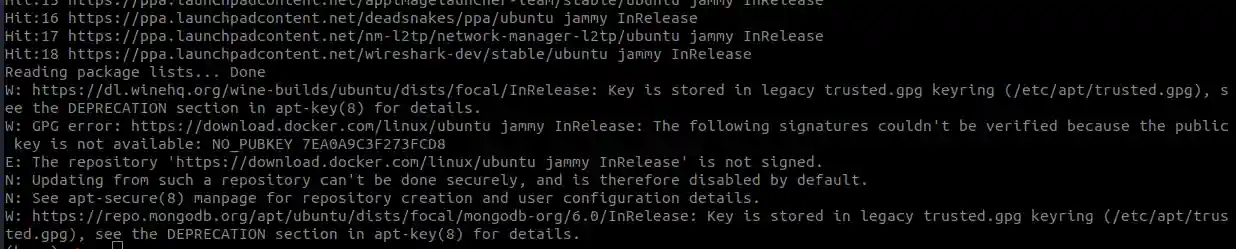W: https://dl.winehq.org/wine-builds/ubuntu/dists/focal/InRelease: Key is stored in legacy trusted.gpg keyring (/etc/apt/trusted.gpg), see the DEPRECATION section in apt-key(8) for details. W: GPG error:https://download.docker.com/linux/ubuntu jammy InRelease: The following signatures couldn't be verified because the public key is not available: NO_PUBKEY 7EA0A9C3F273FCD8 E: The repository ' https://download.docker.com/linux/ubuntu jammy InRelease' is not signed.