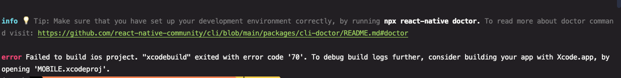 error Failed to build ios project. "xcodebuild" exited with error code '70'. To debug build logs further, consider building your app with Xcode.app, by opening 'MOBILE.xcodeproj'. info Run CLI with --verbose flag for more details.